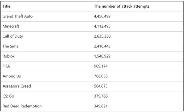 The top-10 exploited games popular with Gen Z by the number of attempted attacks throughout the reported period