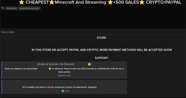 A post from a closed forum advertising a digital store, which sells access to Minecraft and streaming service accounts, boasting over 500 sales